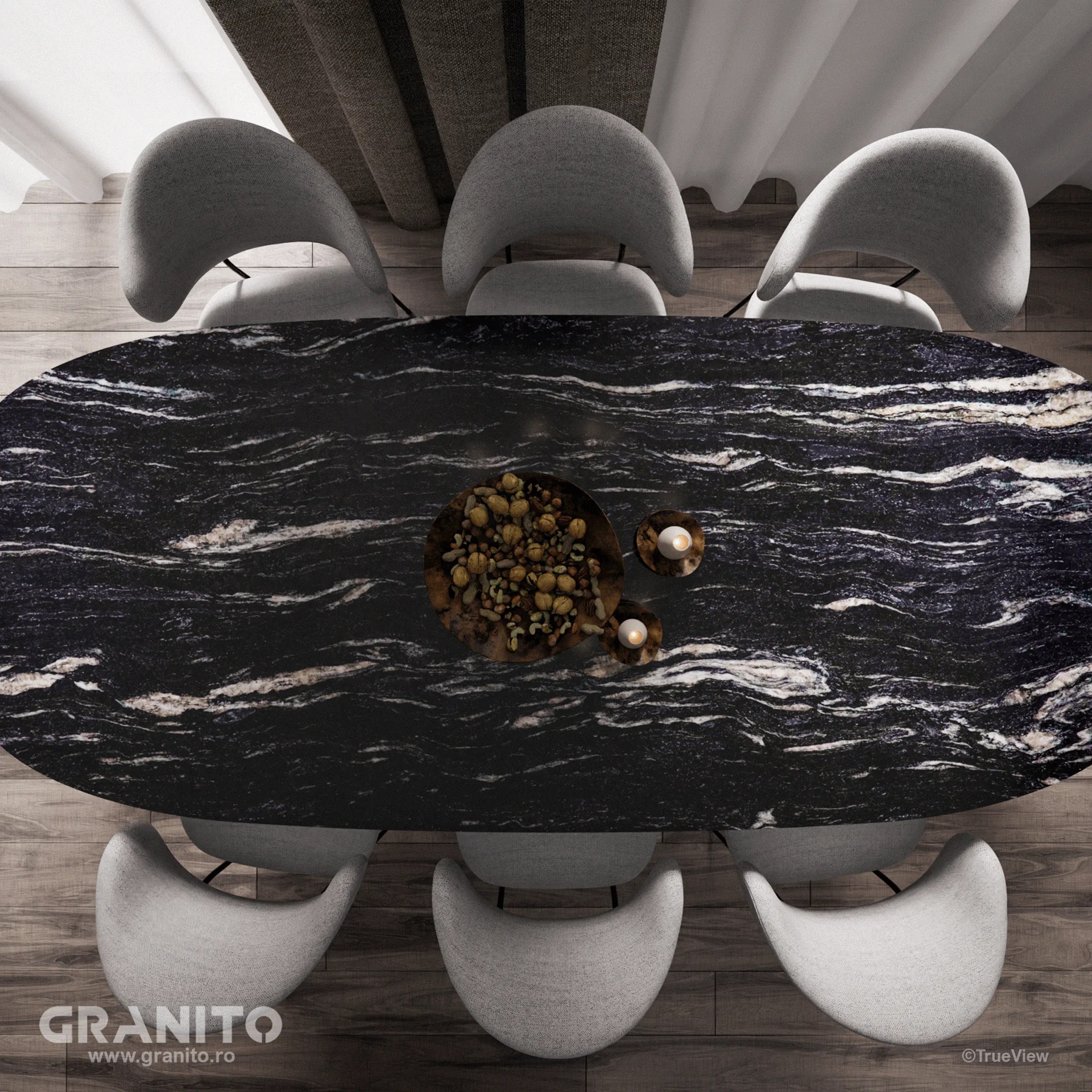Granitul Blue Night este cunoscut pentru adâncimea culorii sale negre îmbogățită cu modele de vene albe și gri care par să aducă la viață suprafața pietrei. Suprafața lustruită a granitului Blue Night poate reflecta lumina, adăugând o dimensiune vizuală suplimentară și o strălucire subtilă în spațiile în care este folosit.