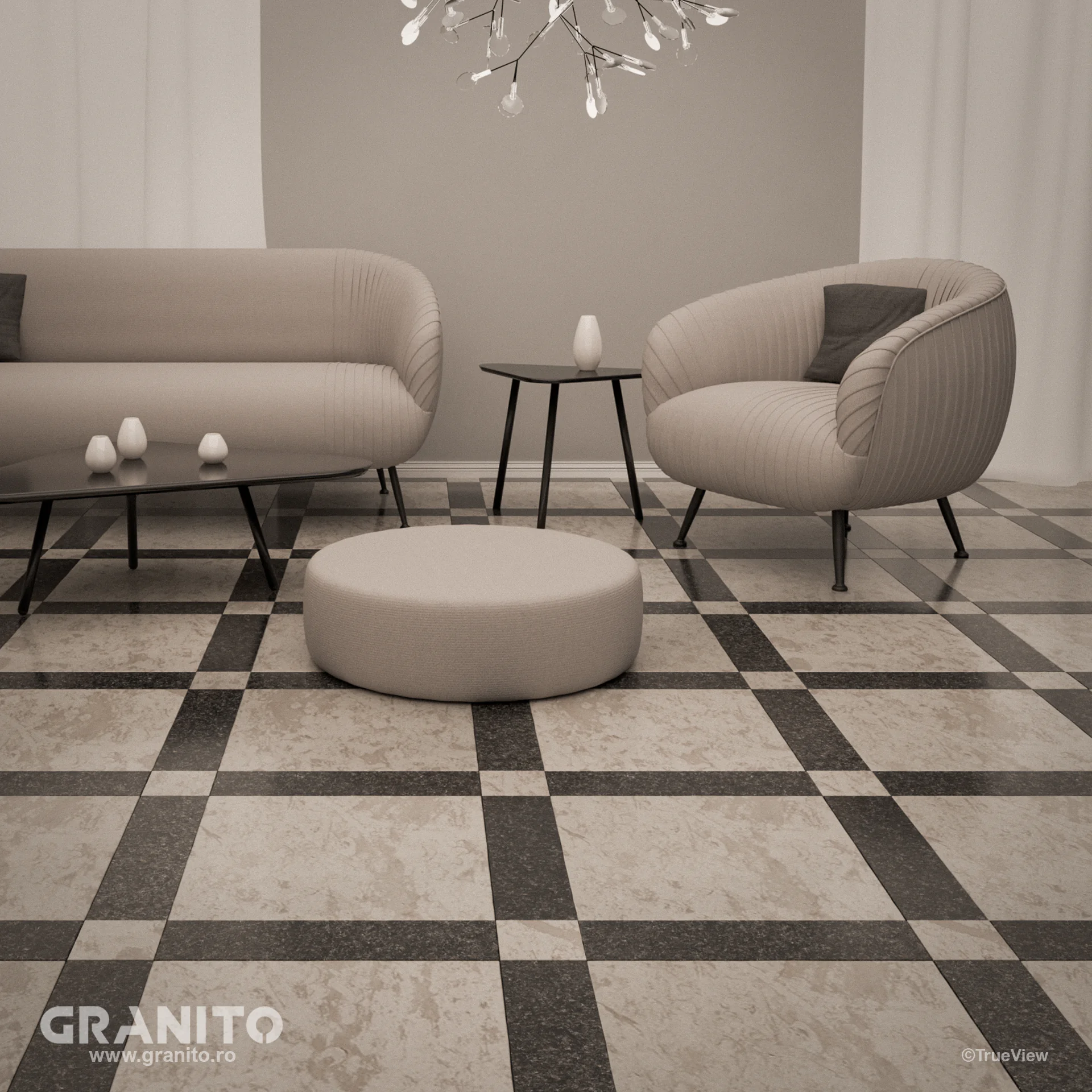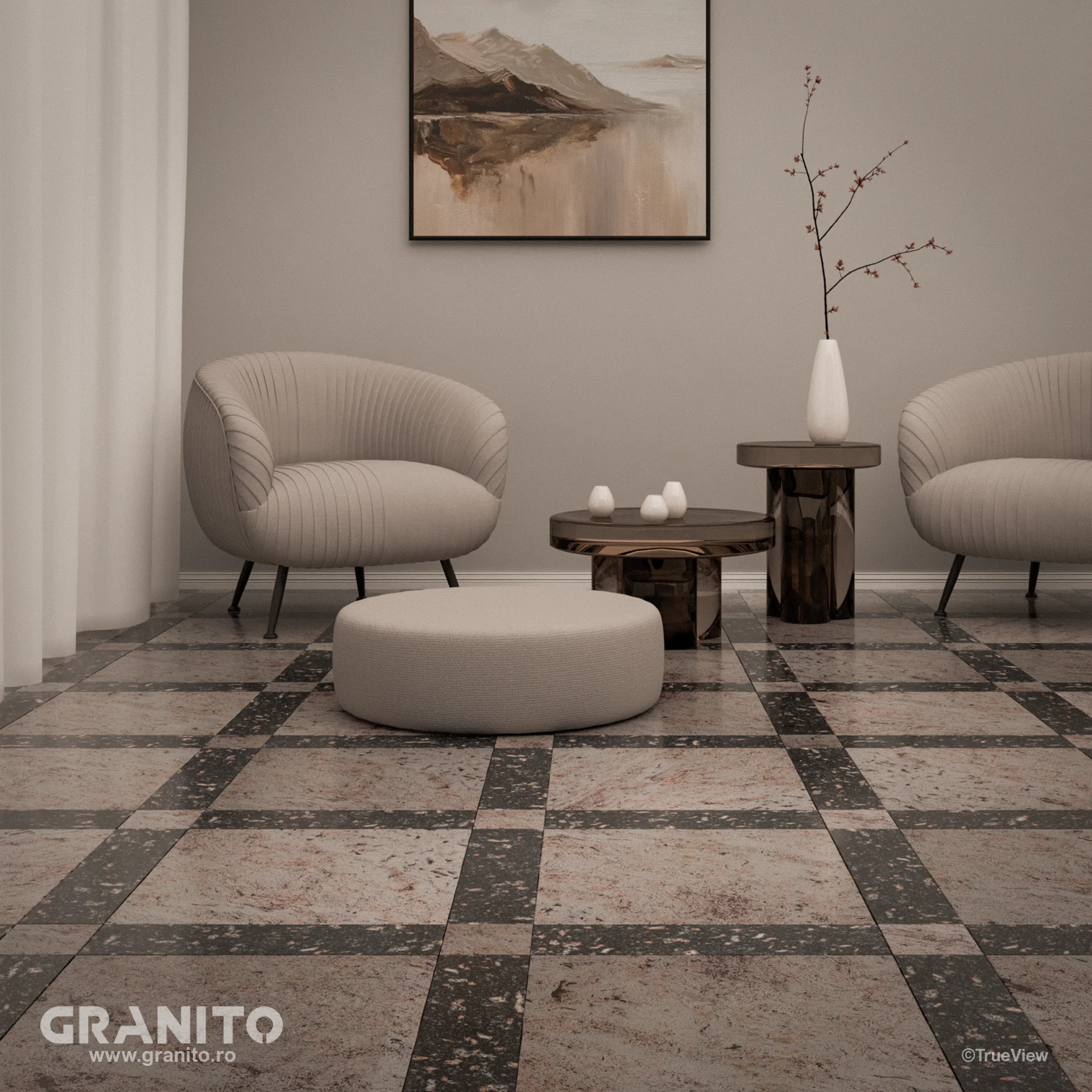 Plăcile se succed într-o armonie desăvârșită, generând o interacțiune elegantă între dimensiunile generoase și cele mai modeste, oferind o profundă senzație de lux și opulență.