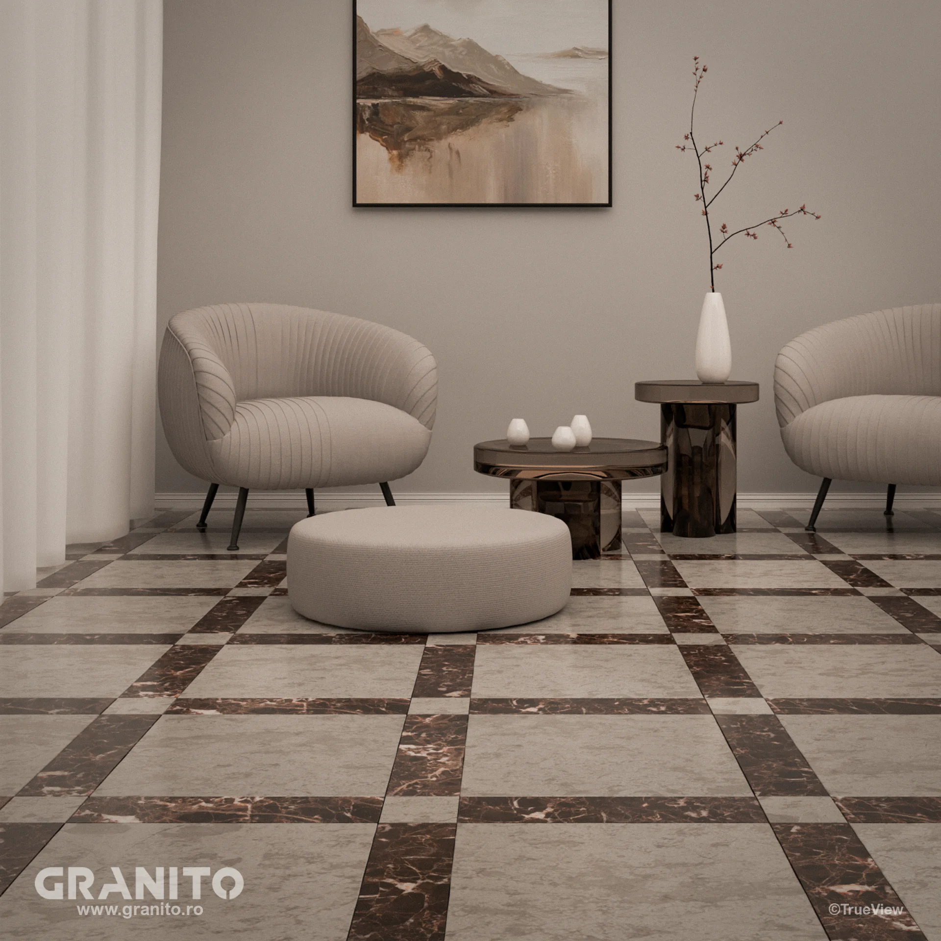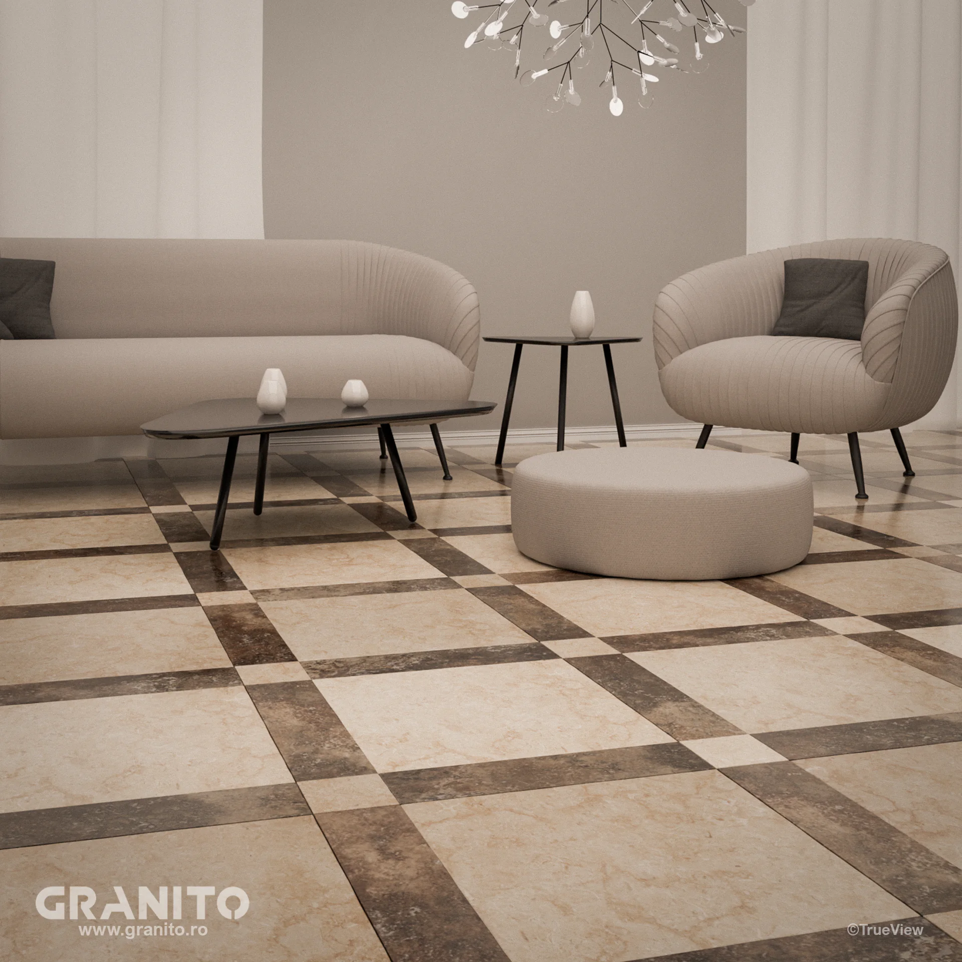 Plăcile se succed într-o armonie desăvârșită, generând o interacțiune elegantă între dimensiunile generoase și cele mai modeste, oferind o profundă senzație de lux și opulență.