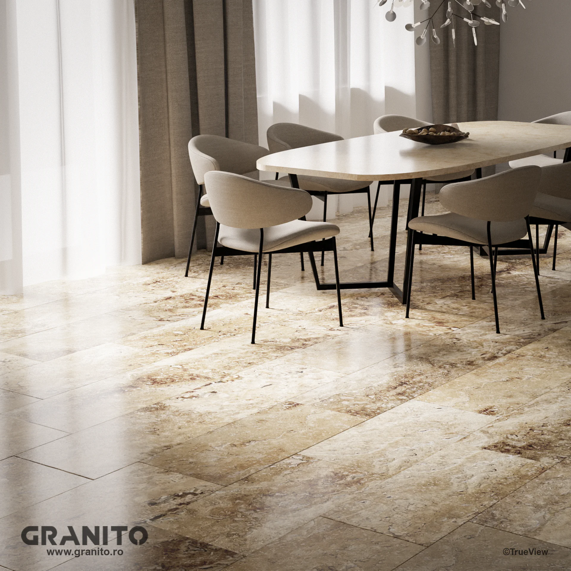 Travertinul Clasic, cu nuanțe calde de crem și bej și vene discrete, aduce eleganță atât interioarelor cât și exterioarelor. Luminos și versatil, este ideal pentru a crea spații relaxante, de la livinguri rafinate la terase însorite și curți îmbietoare.