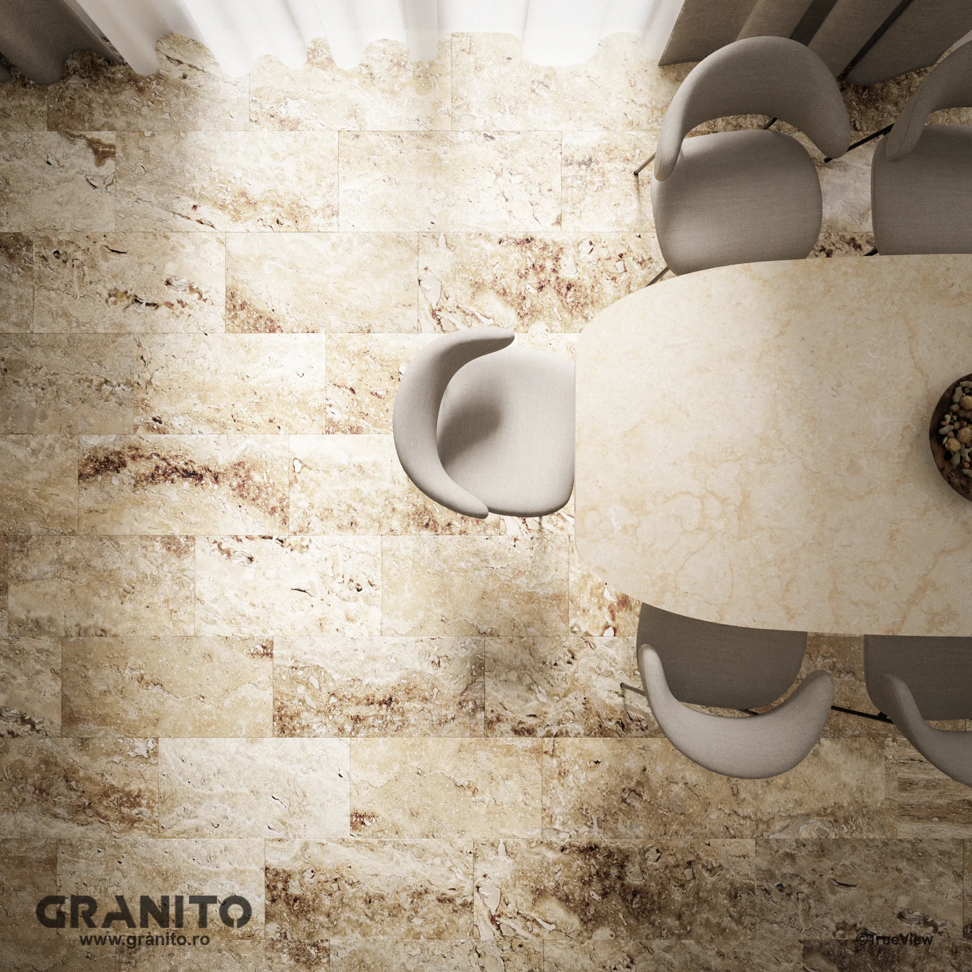 Travertinul Clasic, cu nuanțe calde de crem și bej și vene discrete, aduce eleganță atât interioarelor cât și exterioarelor. Luminos și versatil, este ideal pentru a crea spații relaxante, de la livinguri rafinate la terase însorite și curți îmbietoare.